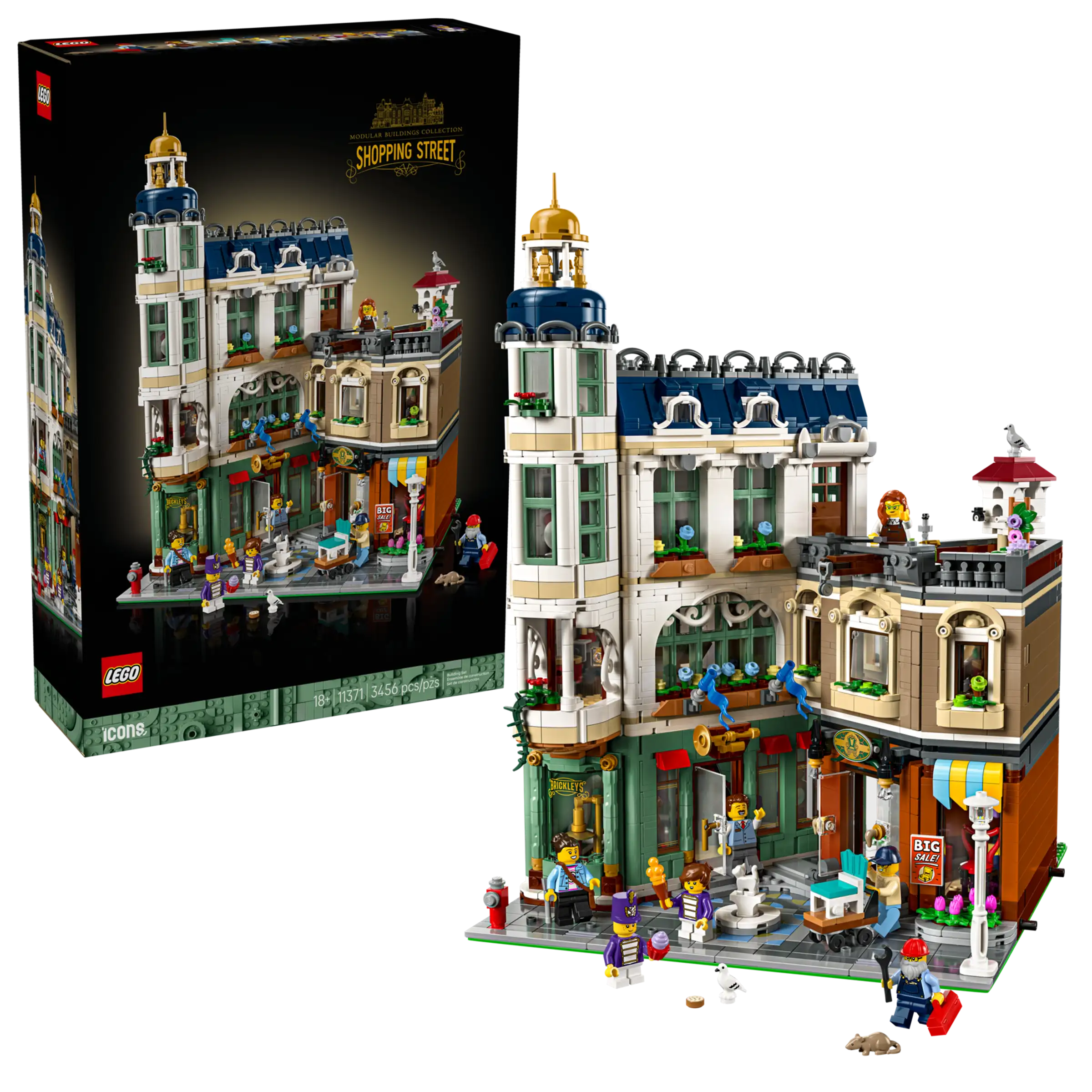 Immerse yourself in a creative project with the LEGO® Icons Shopping Street miniature house building kit for adults (11371). Unwind as you craft this captivating addition to the LEGO Modular Buildings Collection. Inspired by historic European architecture, this richly detailed model features buildings with charming, angled walls, ornate facades, a central alleyway and a classic plaza.
