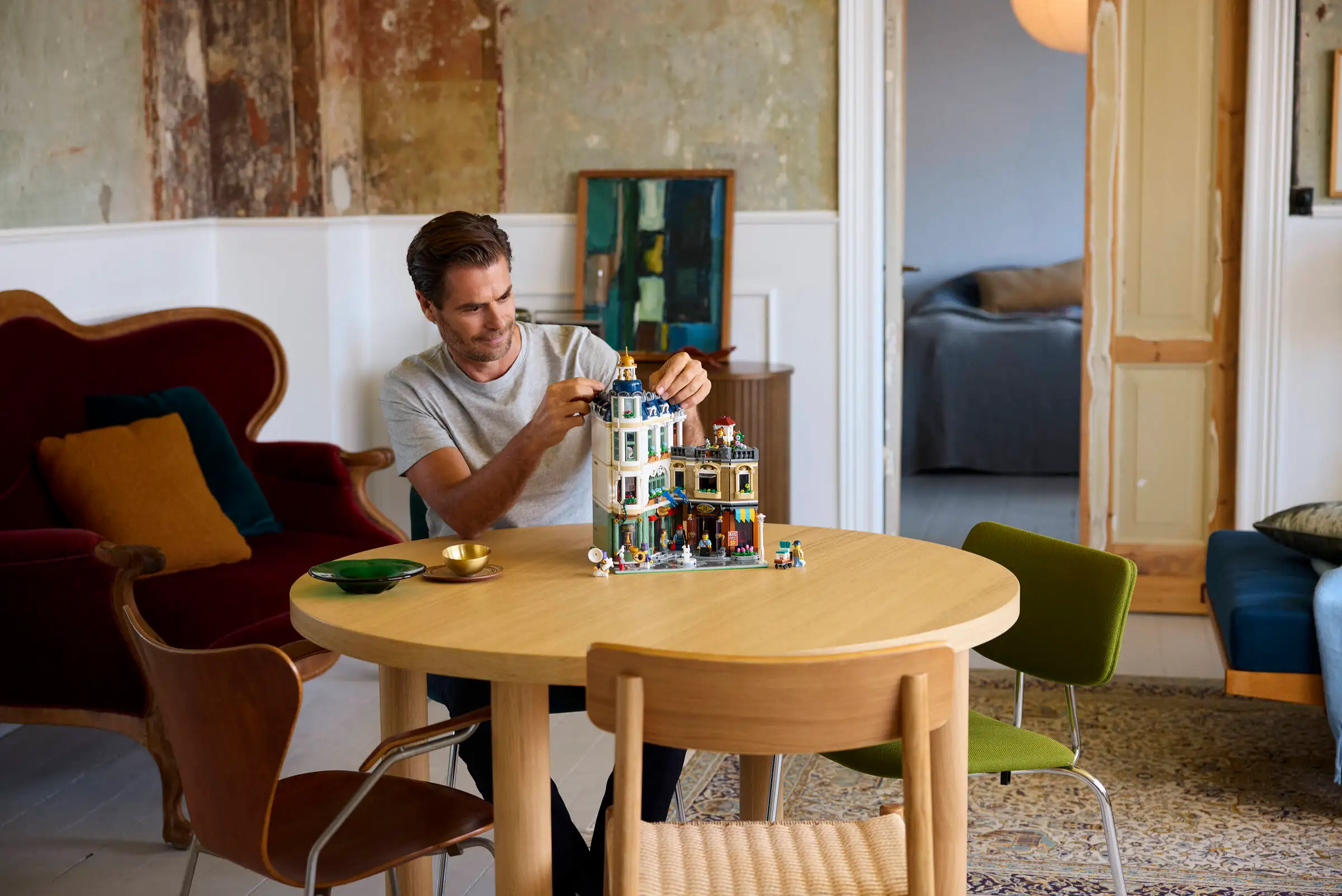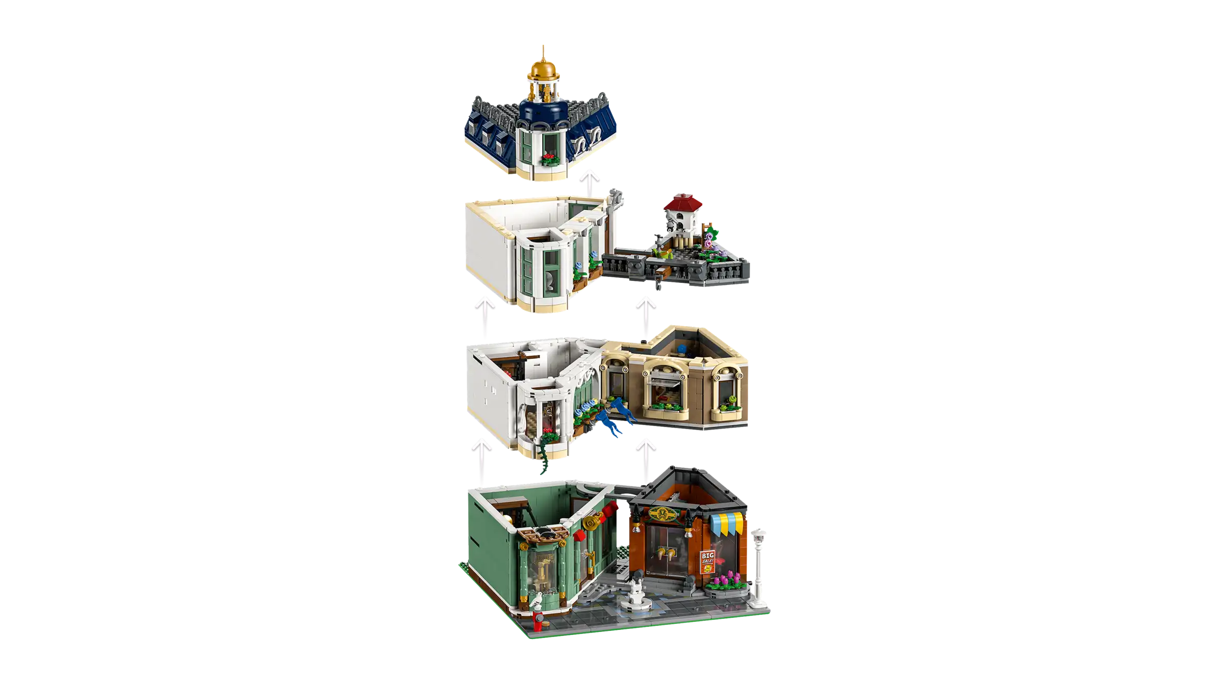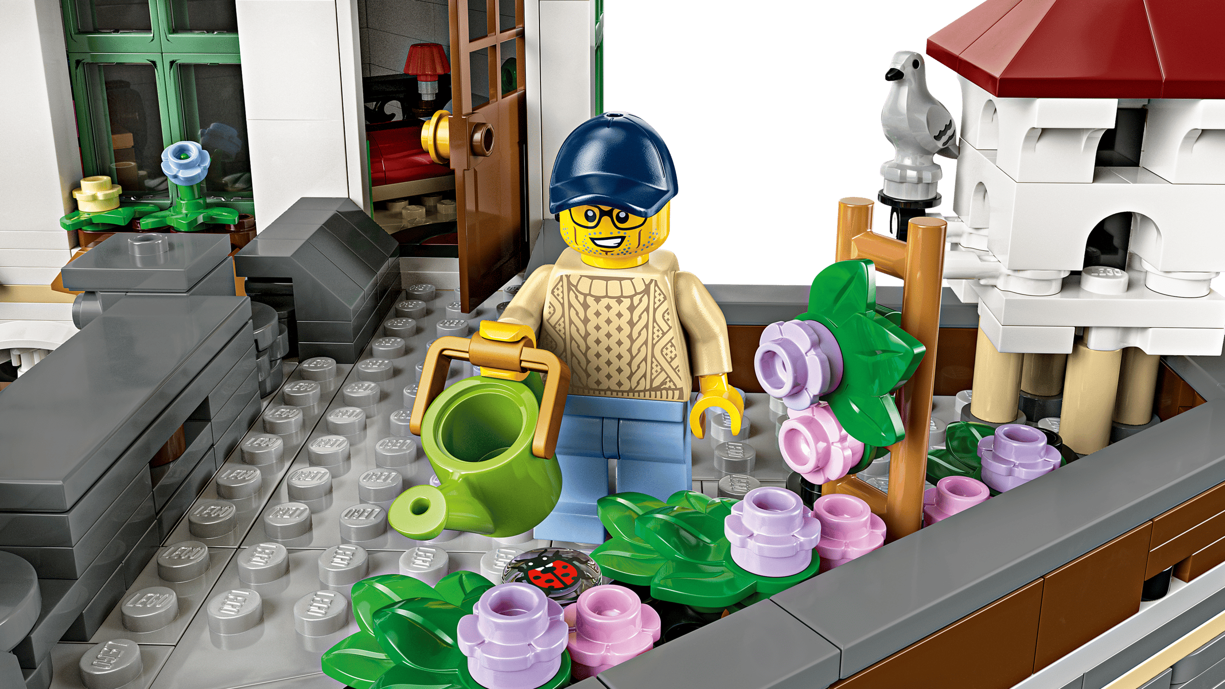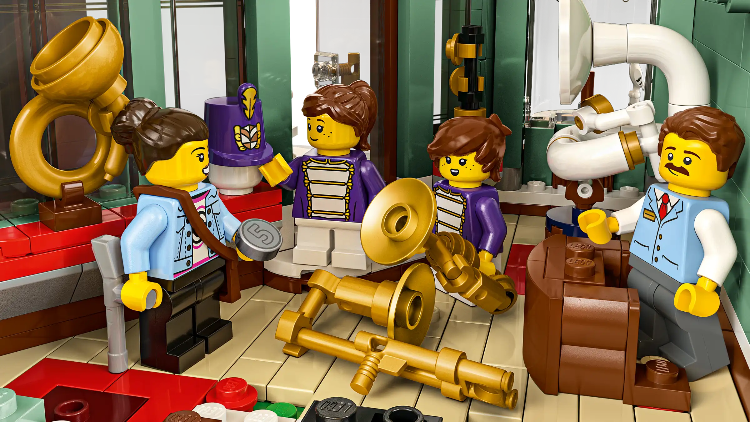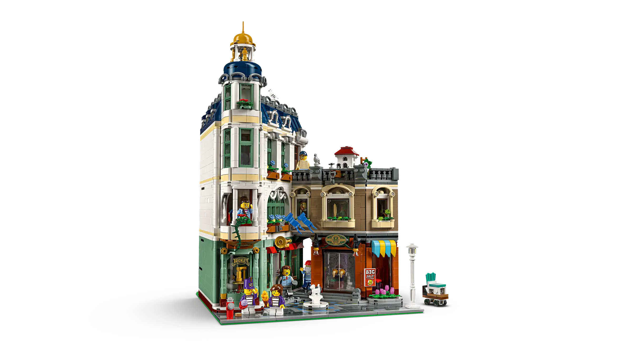 The 3-level building includes a 2-story music shop with marching-band instruments, and an adjacent furniture store complete with a counter, stools, table and workshop. The top floor is home to a furnished apartment with a bathroom, while a roof garden provides space for potted plants and a pigeon coop. Perfect for home office decor this model includes 7 minifigures and a modular design with easy access to the interior.